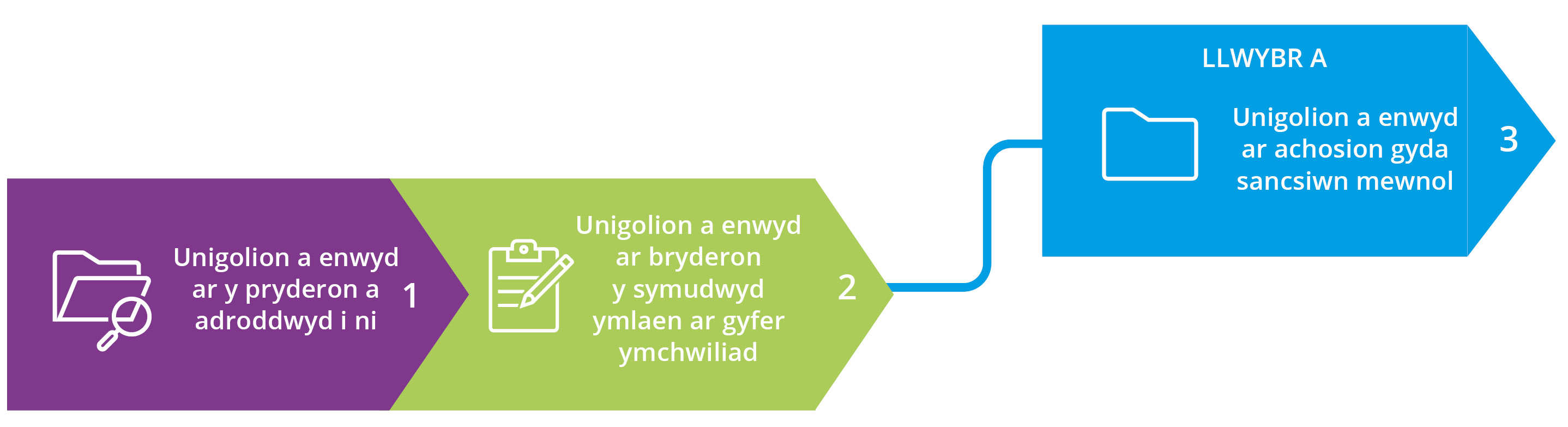 - cam 3 – unigolion a enwyd ar achosion gyda sancsiwn mewnol a’r mathau o sancsiynau a osodwyd gennym (llwybr A)