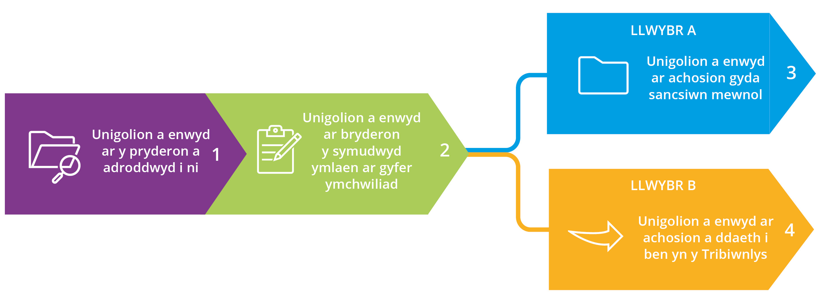 Mae’r diagram isod yn dangos y camau a’r llwybrau hyn. Maen nhw'n cyd-fynd yn fras â'r diagram sy’n amlinellu camau allweddol y broses pan fydd pryder yn cael ei adrodd i ni yn yr adroddiad ar Gynnal Safonau Proffesiynol.
